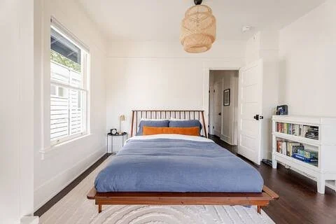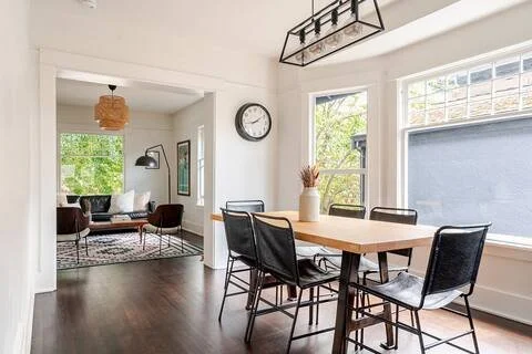 Our work included opening up the kitchen and dining area by removing a dividing wall, refinishing the original floors, and reconfiguring a closet into a dedicated nook for the refrigerator. We also refreshed the bathroom with a light refinishing, carefully matched the original trim throughout, painting throughout and completed the space with thoughtful furnishings.